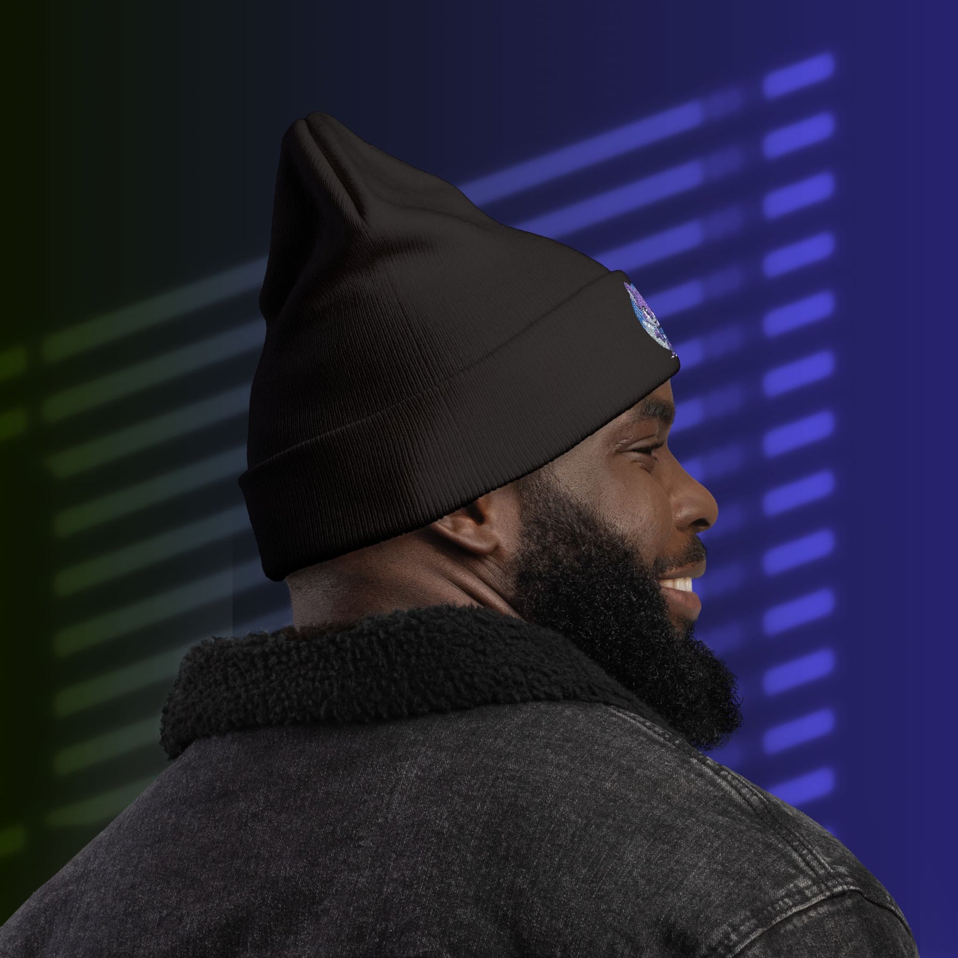 Embroidered Knit Beanie featuring a Cute Baby Werewolf Under The Full Moon design. Perfect winter headwear for animal lovers and monster lovers. Cozy and unique fashion accessory that adds a touch of whimsy to any outfit. Ideal gift for those who appreciate adorable and playful designs. Suitable for Halloween, winter holidays and everyday wear.